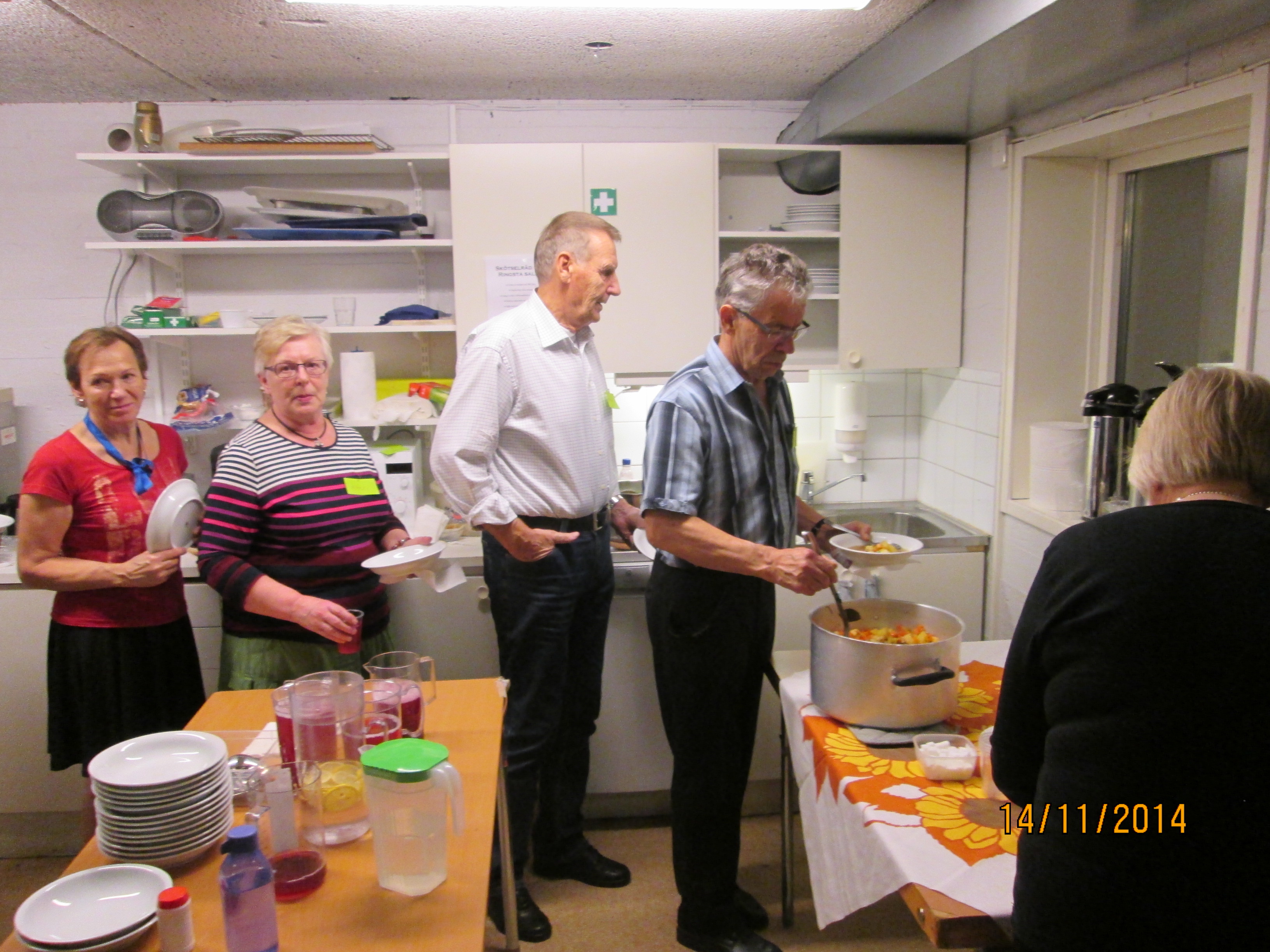 Perillä Malmössa Kirsbergin vapaa-ajantalolla oli toistakymmenpäinen Malmön Suomi Yhdistyksen eläkeläisjaoston Iltaruskon seniorit vastaanottamassa matkalaiset tervetuliaiskahvien kera ja jaoston puheenjohtaja Marja Isbergin tervetuliaistoivotuksen saattelemina.